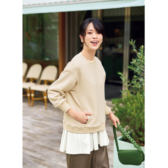 アメリカンコットンを混ぜることで、ダンボールニットの毛玉になりやすさを解消。ふくらみ感のある生地がもちもち伸びて、春先から長く活躍。