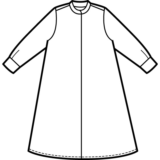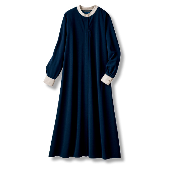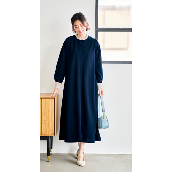 衿と袖口の配色デザインがアクセント。すとんと落ちるシルエットで、おなかやお尻回りをきれいにカバーできます。透け防止のペチコート付き。