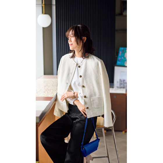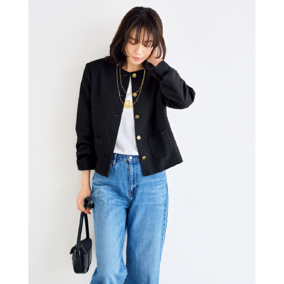 上品ツイードを、コンパクトめのシルエットとアンティーク風ボタンでこなれ見えするジャケットに。きれいめからカジュアルまで活躍。