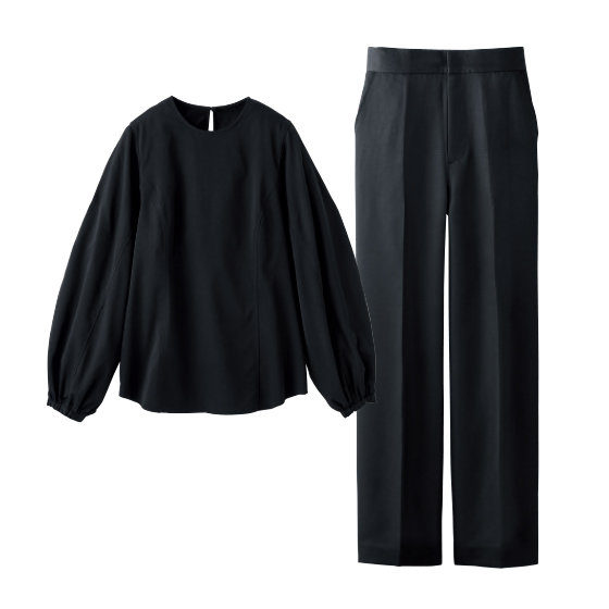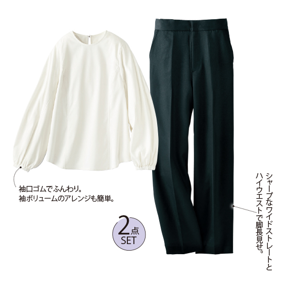 ブラウスは袖口ゴムでふんわり。袖ボリュームのアレンジも簡単。パンツはシャープなワイドストレートとハイウエストで脚長見せ。※通年着用できます。