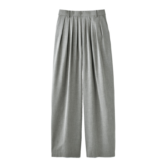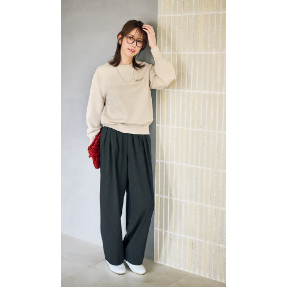 タック効果でお腹をカバーしながら、腰回りゆったり。裾に向かってゆるくカーブする旬シルエットです。さらっとしたウール調の上品生地が、きちんと感で大人映え。※通年着用できます。