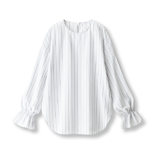 見た目も肌触りもまるでコットン。なのに多機能でお手入れがラクなブラウスです。シンプルで着回しやすく、袖口だけに出る華やぎで大人に上品な着映え感。