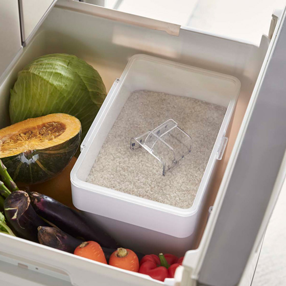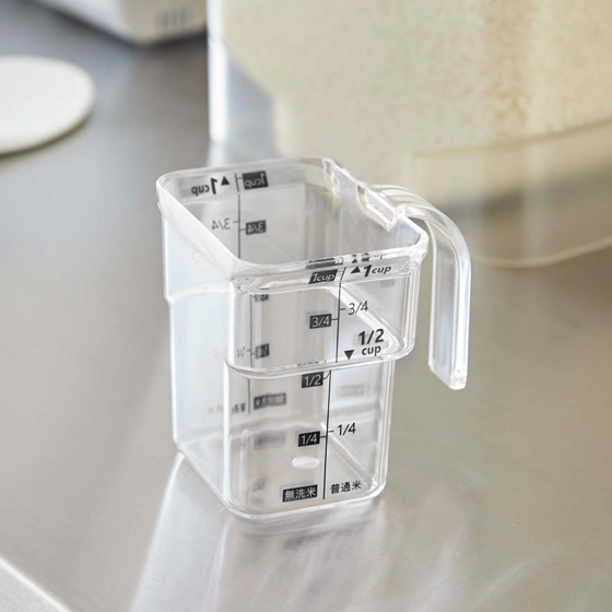 蓋は全面が開くからお米がすくいやすく、残量が分かりやすい透明蓋。底の形が付属の計量カップにピッタリとフィットするので、残りのお米をきれいにすくい取れます。持ち手があるからお米の補充の際の移動も簡単!部品は全て分解して洗えるので、いつでも清潔に保てます。すり切り一杯で1合、段差部分で半合が測れる段々米計量カップ付き。