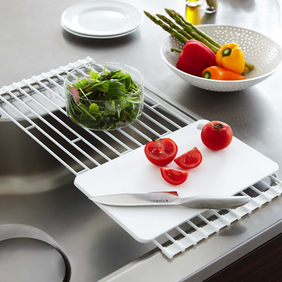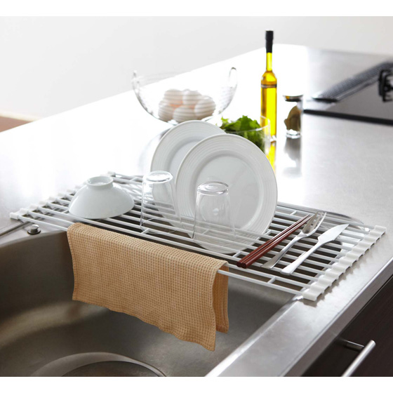 ふきんを干したり、小皿を立てて乾かすことができる水切りラック。調理台の延長として使ったり、料理の盛り付け場としても活用できます。量が少ない時には、使いたい幅にたたんで水切りが可能。キャップとワイヤーが取り外せるので、水道蛇口を避けて設置することもできます。使わない時はクルッと巻いて収納できるので、場所を取らずに便利です。