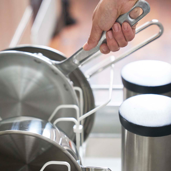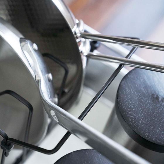 鍋やフライパンのサイズに合わせて仕切りパーツの位置を3cmごとに調整可能。持ち手が上になる設計で取り出しやすく、下に空いたスペースで収納力もアップ。キッチンの整理整頓に最適なアイテムです。