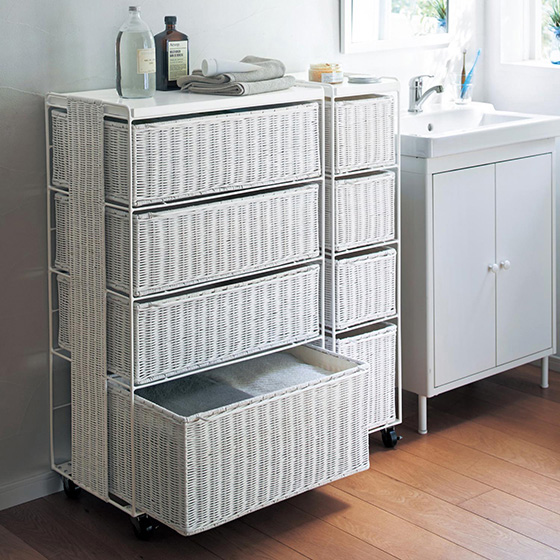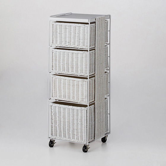 スチールフレームを組み合わせることで、軽やかな見た目と丈夫さを両立しました。キャスター付きで移動もラク。引き出しは通気性が良く、内布付きなのでタオルや衣類の収納にぴったり。側面にも贅沢にラタンを編みこみ、インテリア性をアップ。