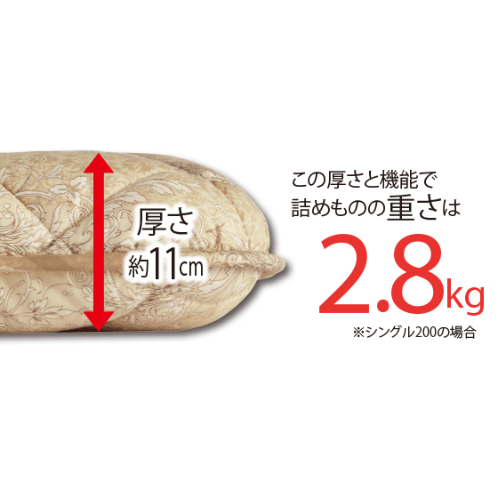 ●素材:側地=綿100%、詰めもの=巻わた/ポリエステル100%(1穴中空わた使用、抗菌防臭・防ダニ加工、吸汗速乾加工)、中芯/特殊形状凹凸ウレタンフォーム(シングル200=計2.8kg、シングル210=計3kg、セミダブル=計3.6kg、ダブル200=計4.2kg、ダブル210=計4.3kg)