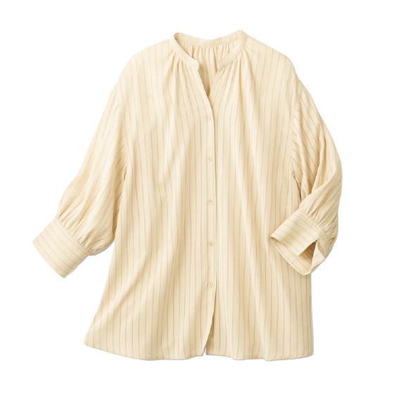 ドレープ感が美しいバックサテンのブラウス。ストライプ状のドビー織が上品で、流れ落ちるギャザーもエレガントです。二の腕カバーが叶う7分袖で。