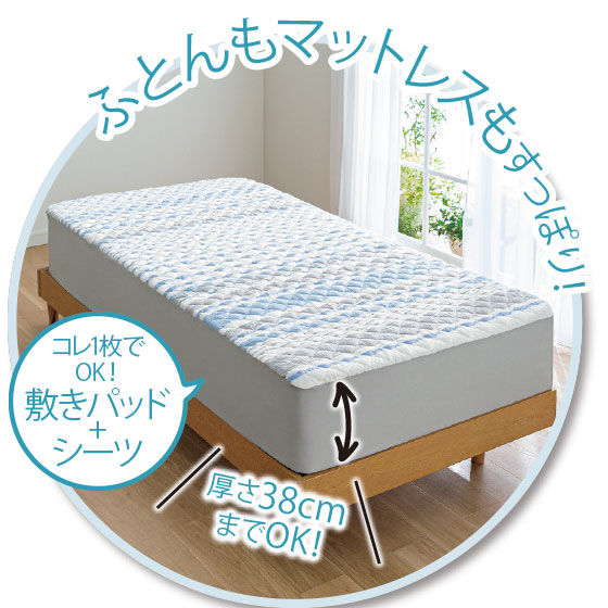 敷きパッドとボックスシーツを一体化した時短寝具。マチが伸びるニット素材でぴったりフィット。着脱も洗濯もラク!