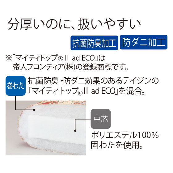 巻わたは抗菌防臭・防ダニ効果のあるテイジンの「マイティトップ(R)2 ad ECO」を混合。中芯はポリエステル100%固わたを使用。