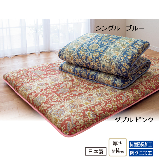 ●素材:側地=綿100%、詰めもの=巻わた/ポリエステル100%(中空糸1穴使用、抗菌防臭・防ダニ加工)、中芯/ポリエステル100%固わた(シングル=計4.5kg、ダブル=計6.3kg)