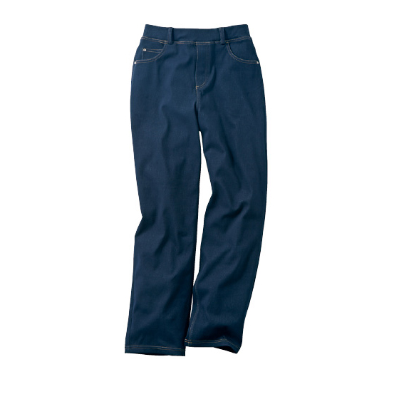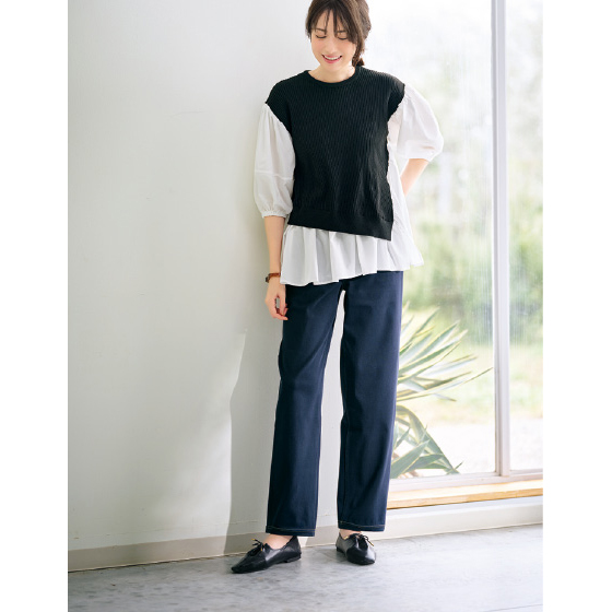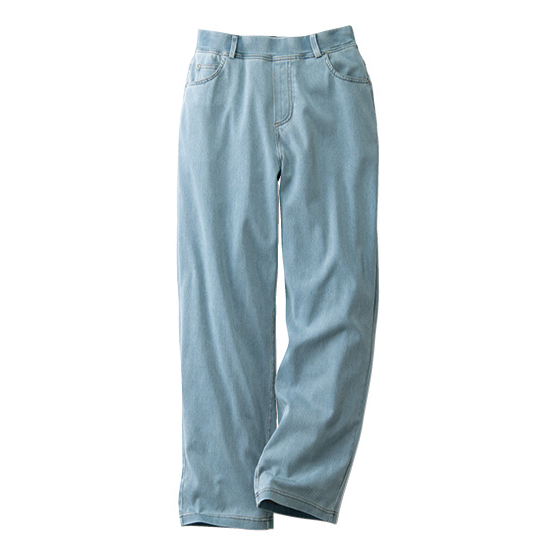 腰から太ももは丸く、裾幅はやや狭くして、すとんと落ちるシルエットに。※春夏秋、3シーズン着用できます。