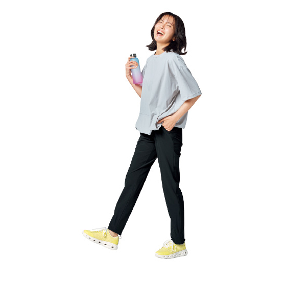 ほのかな落ち感があり、肌にゆるく寄り添います。ウエストは総ゴム&スピンドル仕様で調節が可能。
