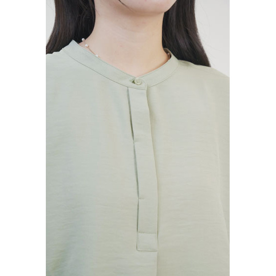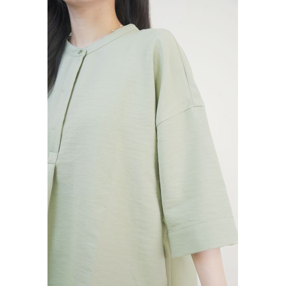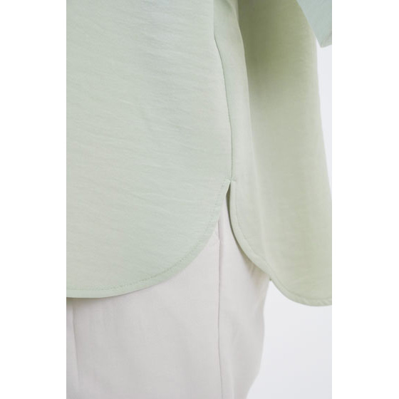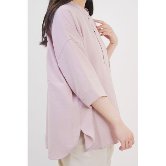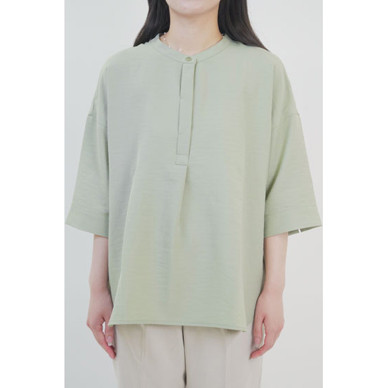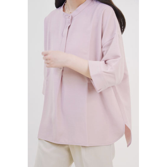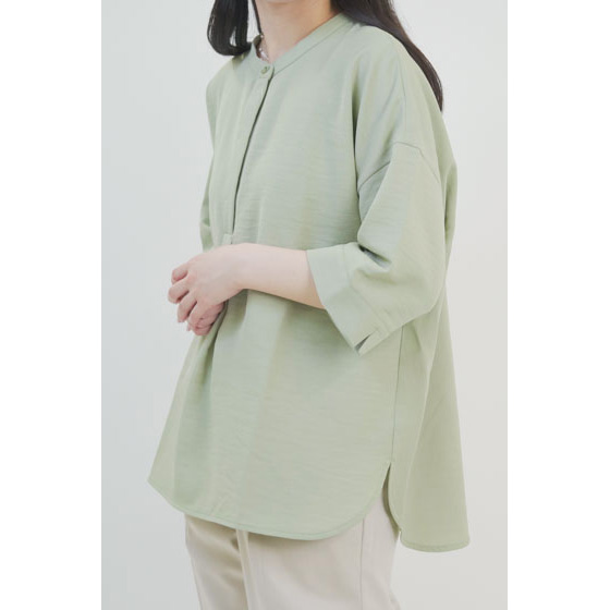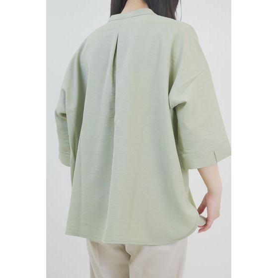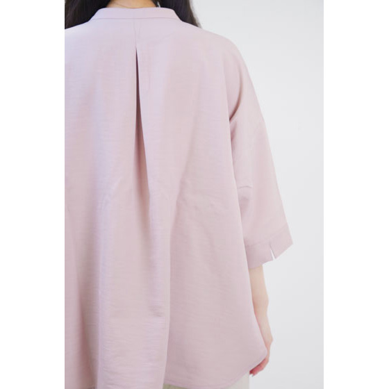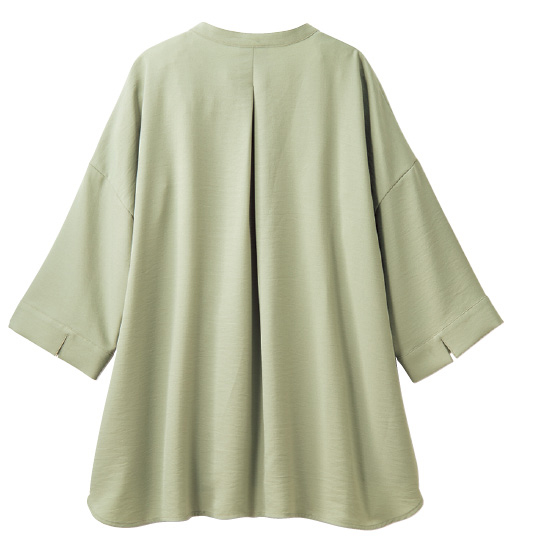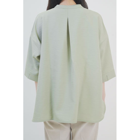 シボ感のあるヴィンテージ風の生地で甘さを抑えて、ゆるシルエットでリラクシーな着心地。バンドカラーや比翼前立てできちんと見えし、背中のタックで後ろ姿もきれいに。