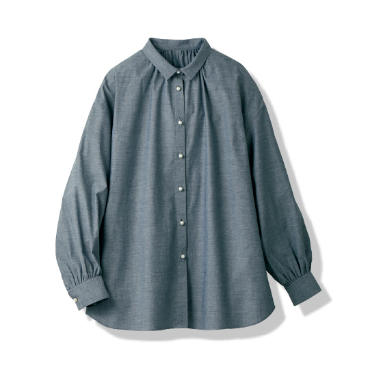 デニム見えするコットン生地を、ふんわり袖の今シルエットに。衿元ギャザーとパールボタンで、アクセいらずの華やぎ感です。