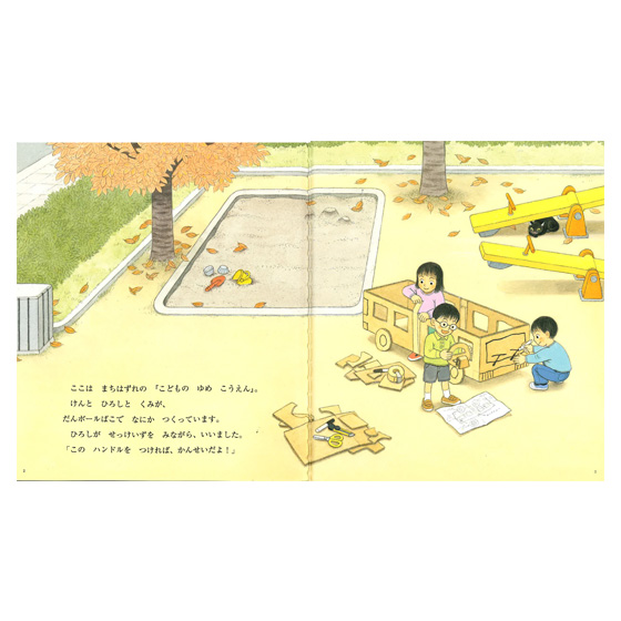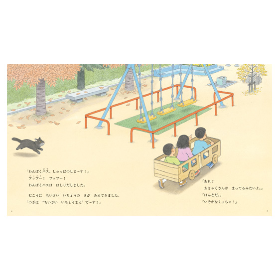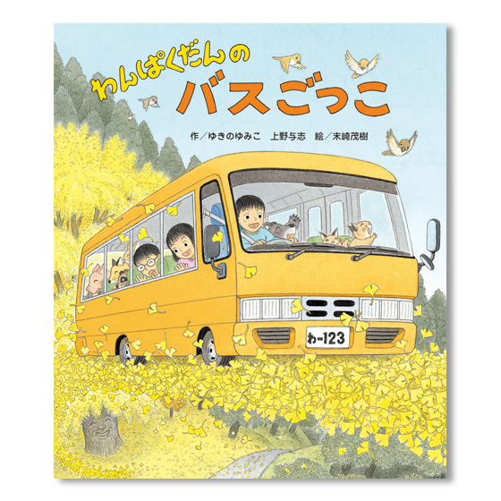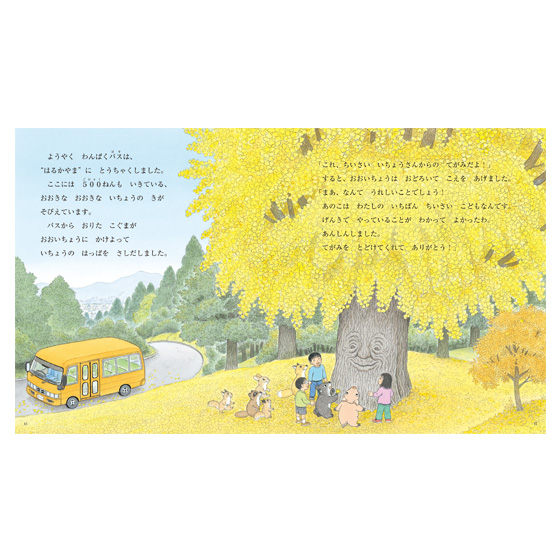 バスごっこをするために作った段ボールのバスが、遊んでいるといつの間にか本物のバスになっていました。そこに乗り込んできたのは、こぐまやリスやウサギたち。“はるかやま”の大イチョウのところまで届け物にいきたいというのですが…。