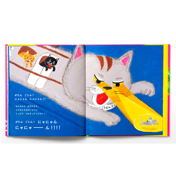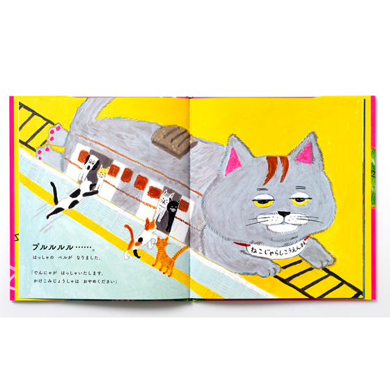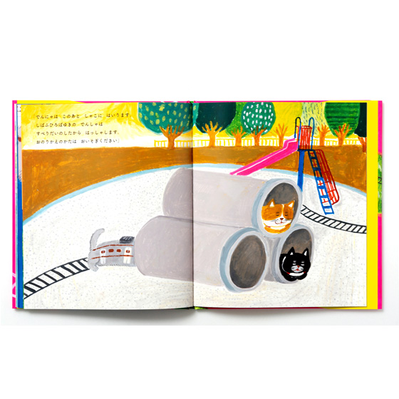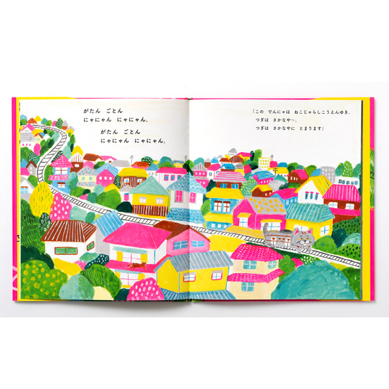でんにゃはねこの電車。がたんごとん、にゃにゃんにゃにゃん。魚屋さんでごはんを食べたり、屋根の上で昼寝したり、ねずみを追いかけたりと、寄り道ばかり。なかなか目的地に到着しません。