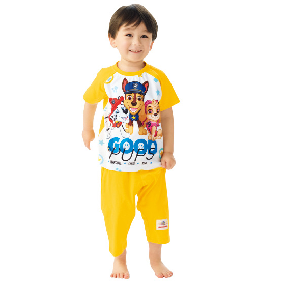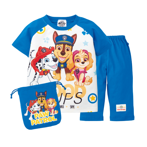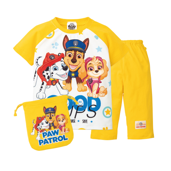 両わきボタン付き。おなかが出にくくなるようにボタンを付けました。便利な巾着付きで、持ち運びしやすく、お泊まりにも活躍。