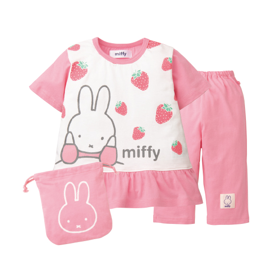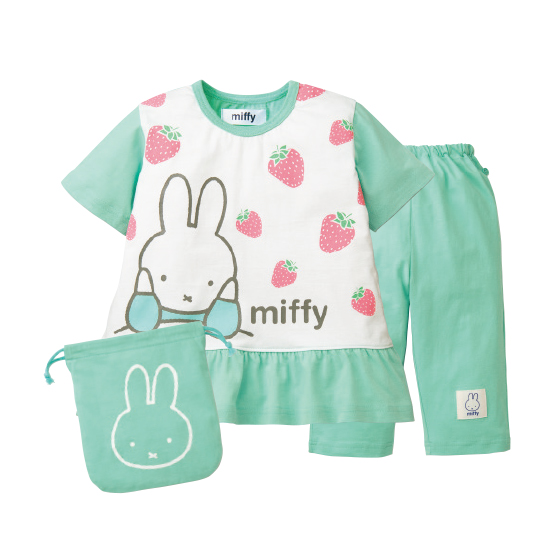 両わきボタン付き。おなかが出にくくなるようにボタンを付けました。便利な巾着付きで、持ち運びしやすく、お泊まりにも活躍。