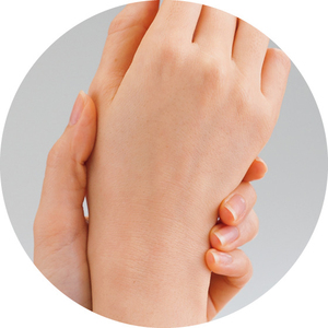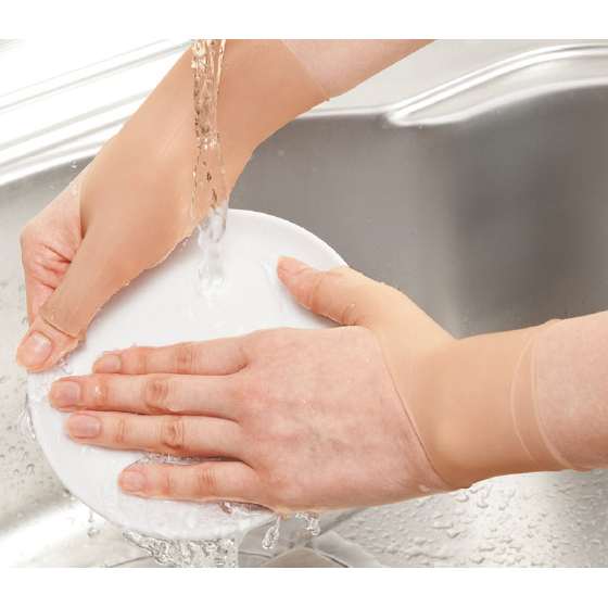 親指の開閉や手首の動きを、ゲル素材のサポーターで自然に支えます。半透明の薄型でしっかり密着。動きを妨げません。つけたままの水仕事や入浴も可能。