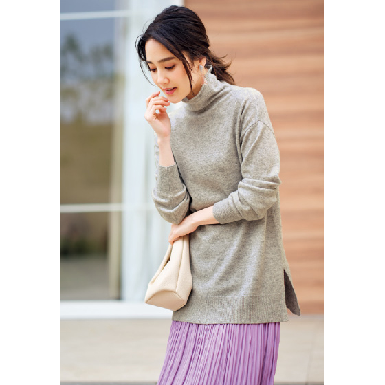 カシミヤ山羊のやわらかな原毛を使ったぜいたくな風合い。とろけるような肌触りと、やわらかく軽やかな着心地も魅力です。編み地の表面は繊細で美しい光沢感があり、大人にふさわしい上品さでコーデをワンランクアップ。