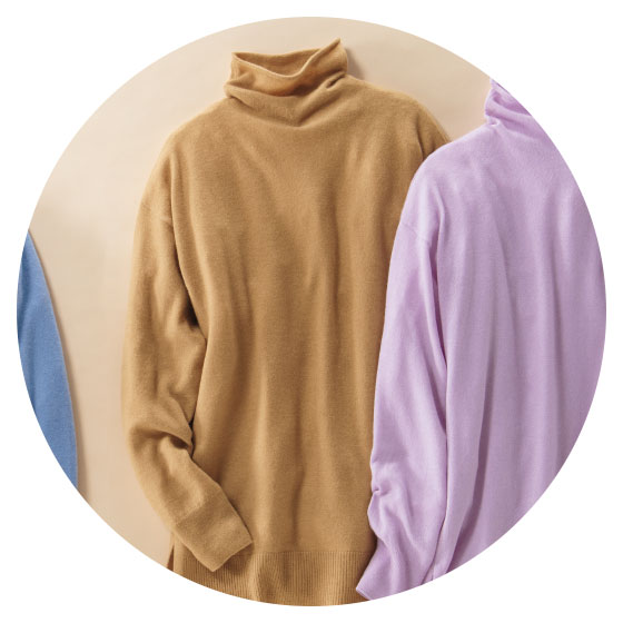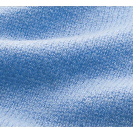 カシミヤ山羊のやわらかな原毛を使ったぜいたくな風合い。とろけるような肌触りと、やわらかく軽やかな着心地も魅力です。編み地の表面は繊細で美しい光沢感があり、大人にふさわしい上品さでコーデをワンランクアップ。