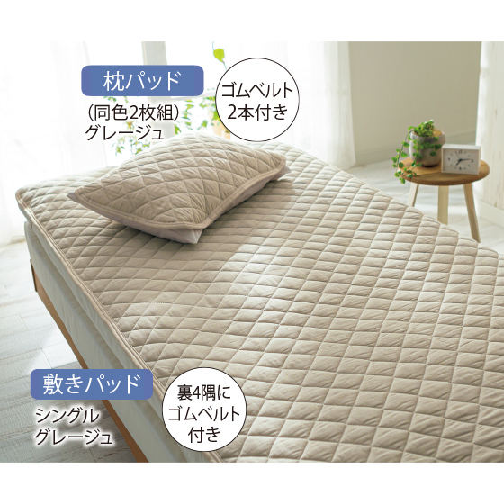 ●裏4隅にズレ防止のゴムベルト付き(敷きパッド)、ゴムベルト2本付き(枕パッド)