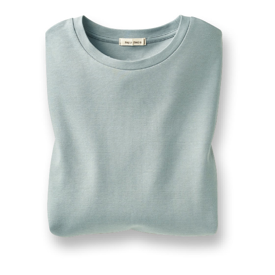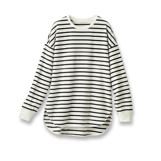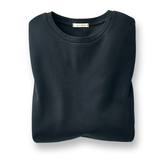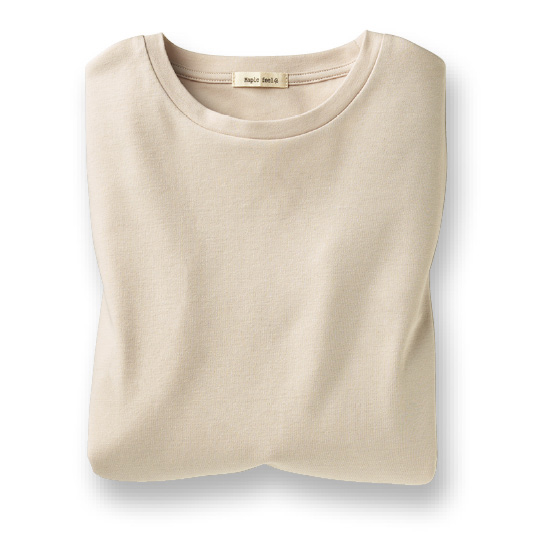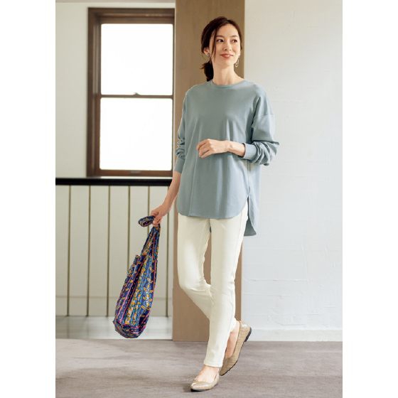 ほどよく肉厚な生地で体のラインを拾いにくく、1枚ではもちろん、冬は重ね着にも重宝。どんなボトムスにも合わせやすいシンプルデザインです。