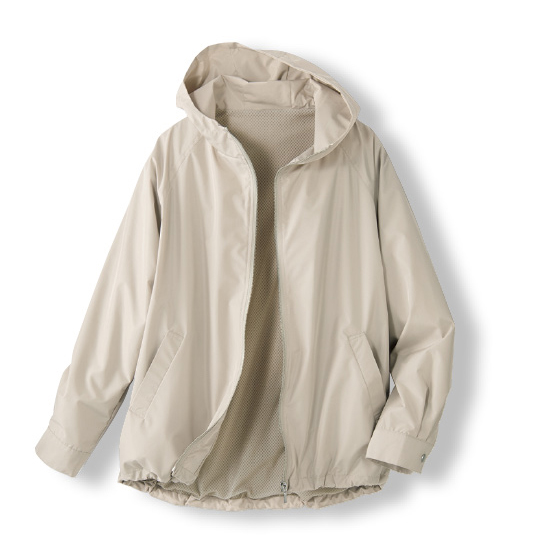 表地は風をカット、裏地は体の湿気で発熱する起毛メッシュ。はおるとほんのり暖かなブルゾンです。小さくバッグに入る薄さと軽さで、朝晩が肌寒い頃に便利。