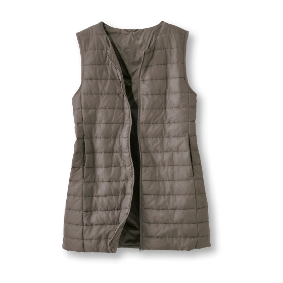 ロング丈で腰まで暖かい。薄くて軽く快適な着心地の中わたベスト。