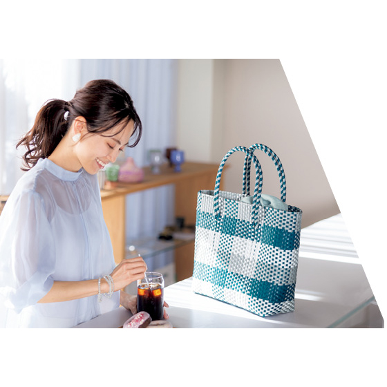 汚れが気になったら手軽に丸洗いOK。水に強い素材の編み込み仕上げ。安定感があり、収納たっぷり。口も広く出し入れがラクなマルシェ風バッグ。