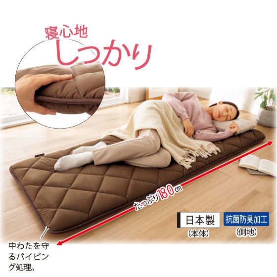 まるでおふとんみたいな、しっかりしたつくり。弾力のある固わた入り3層構造で、底付き感が少ない寝心地。キルト仕上げにして中わたがズレにくい工夫も。3ツ折りで収納できるのも◎。