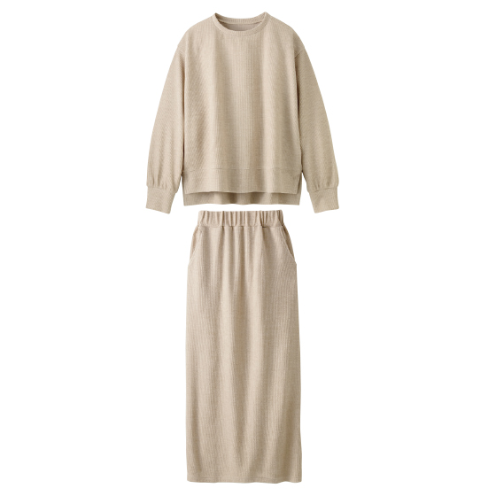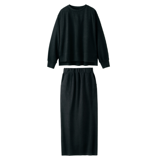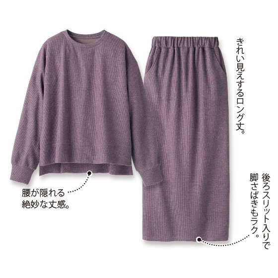 立体感のあるリブ編みニットソー。トップスは腰が隠れる絶妙な丈感、スカートはきれい見えするロング丈。※秋冬におすすめです。