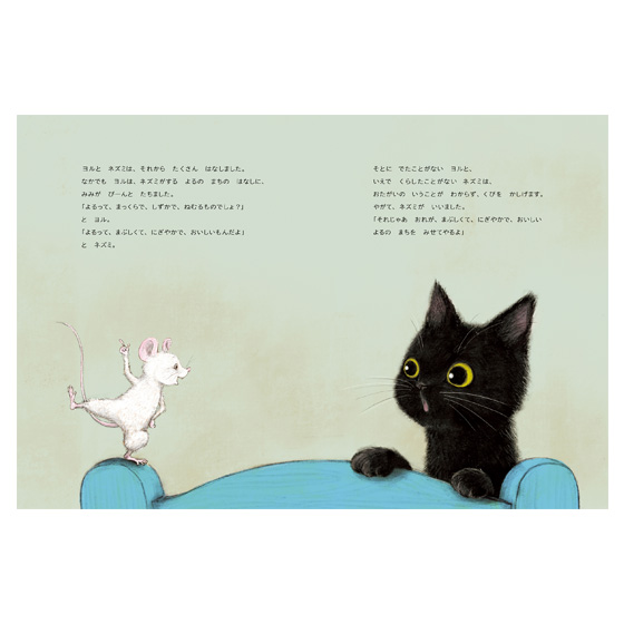 外に出たことのない黒猫のヨルと、家で暮らしたことがない町のネズミ。ヨルはネズミに誘われて、生まれて初めて、まぶしくてにぎやかな夜の町へ。子猫とネズミの、ファンタジックで特別な夜のお話です。