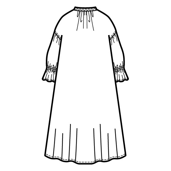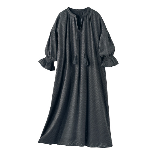 立体的なジャカード素材が目を引くワンピース。袖口のゴムシャーリングやタッセル使いなど、細部にまでこだわりが光る1枚に。