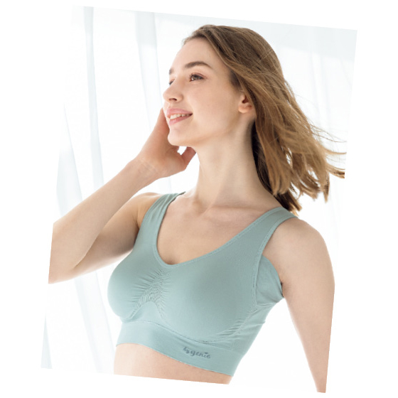 はみ肉を収めてスッキリ見せる。厚みのある下パッドで、流れ胸を寄せてバストアップ!バスト回りとサイド部分のリブ編みで、快適にホールド。