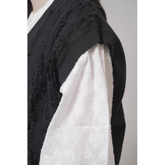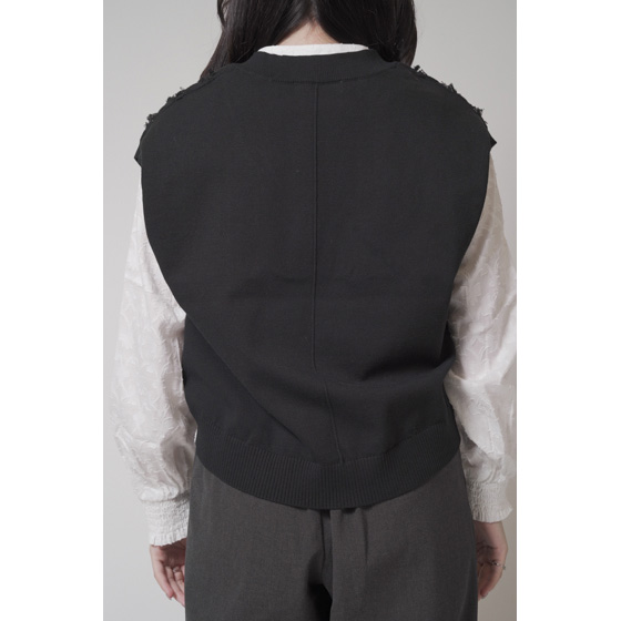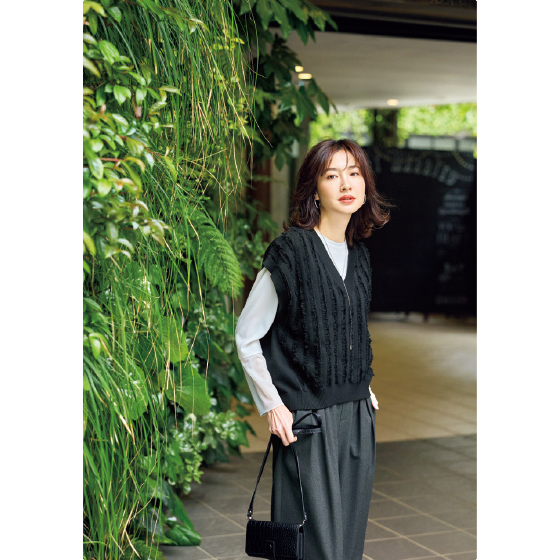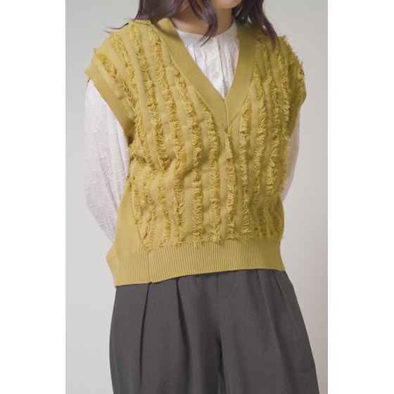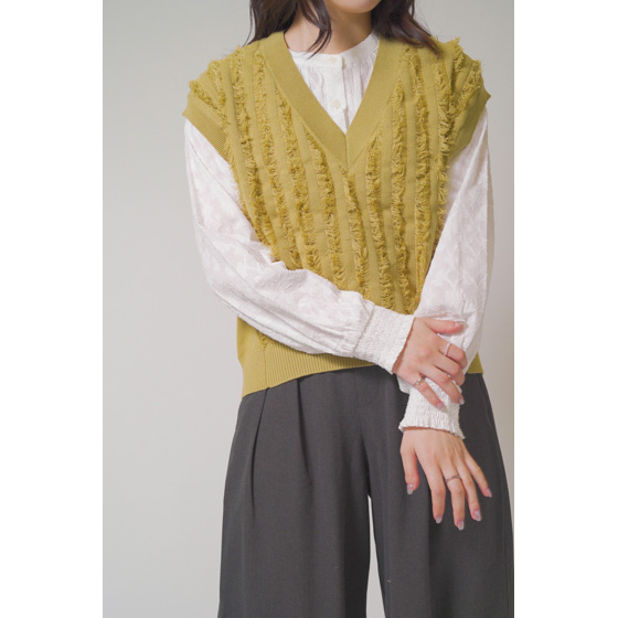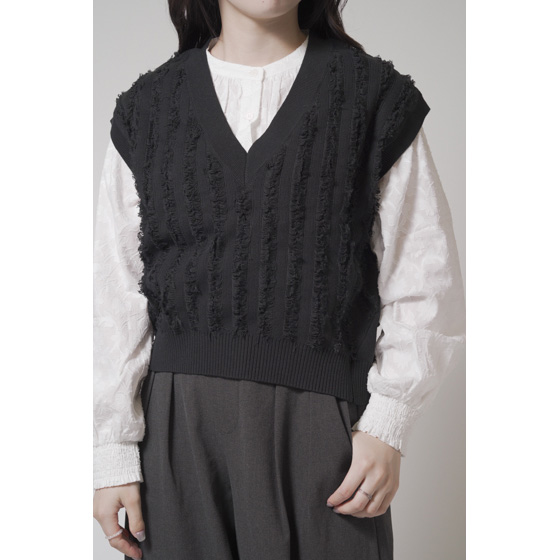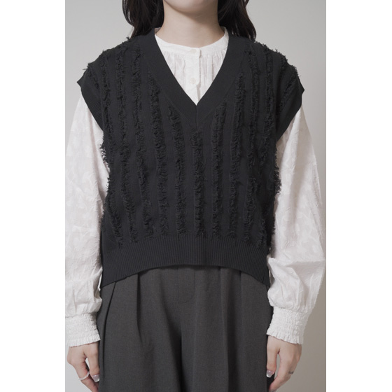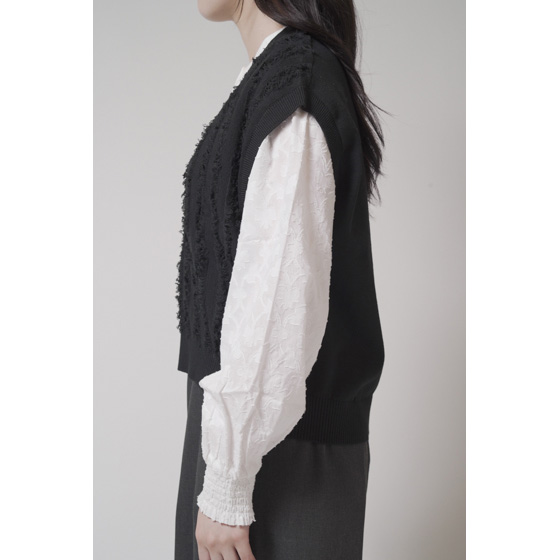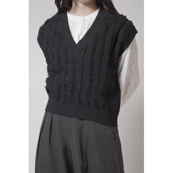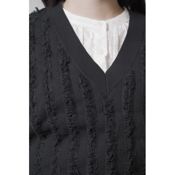 前は毛足のあるフリンジ柄、後ろはシンプルな天竺編み。着心地はゆったりながら、深めのVネックですっきり見え。