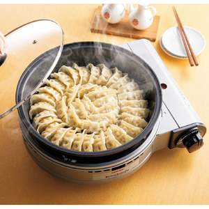 1台6役で災害時も心強い。調理の幅が広がる5.3cmの深型プレート。プレートはこげつきにくいフッ素樹脂加工、ごとくは外して洗えるので後片付けがラク。
