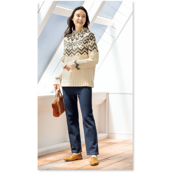 ●素材:ブラック=綿50%・アクリル45%・ポリウレタン5%、デニム調ネイビー・杢調グレー=アクリル45%・綿30%・ポリエステル20%・ポリウレタン5%(ニット、裏起毛・タテヨコのび)