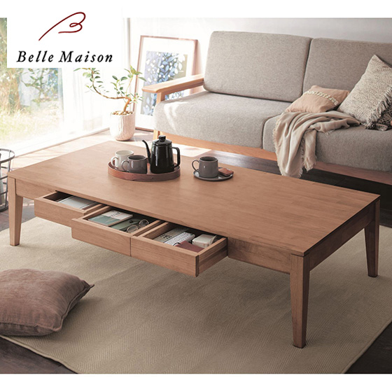 リモコンや文具、新聞など散らかりがちな小物を片付けるのに便利な引き出し付きテーブル。(引出し内寸24.5cm×38.5cm×6cm)
