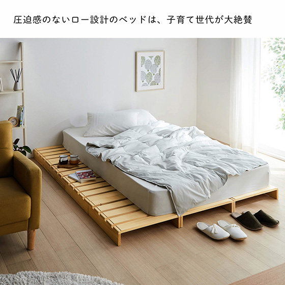 連結金具をなくして、床面用は置くだけで完成!簡単に組み替えや設置ができます。1人暮らしや2人での新生活にシンプルなローベッドとして、家族が増えたら買い足してキングサイズのベッドにも。床面高が10cmと低いので小さいお子さまと一緒に寝るときも安心です。