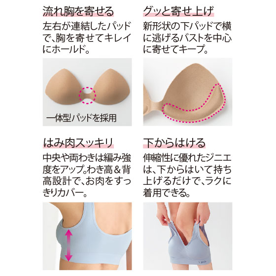 通気性の高い全面メッシュに。カップ部分のムレにくさもアップ。肌に触れるとひんやり。穴あきパッドでムレにくい。無数の穴が風を通しバストの汗や熱気を逃がしてさわやか。
