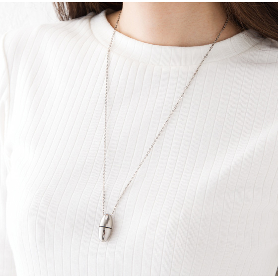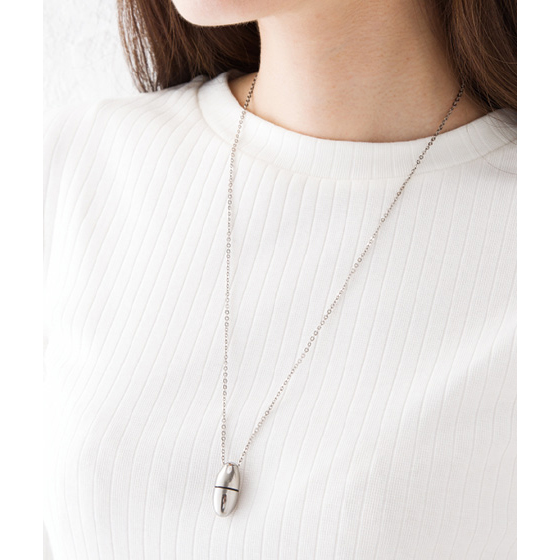 ●サイズ:ウフ=カプセル部/径1.15×高2.5(内寸=径0.7×高1.3)cm、グラン=カプセル部/径1.38×高2.5(内寸=径0.7×高1.35)cm、チェーン=幅0.2×長60cm(共通)