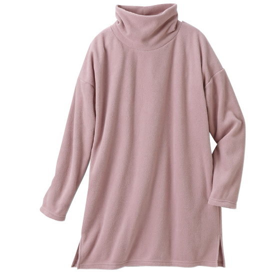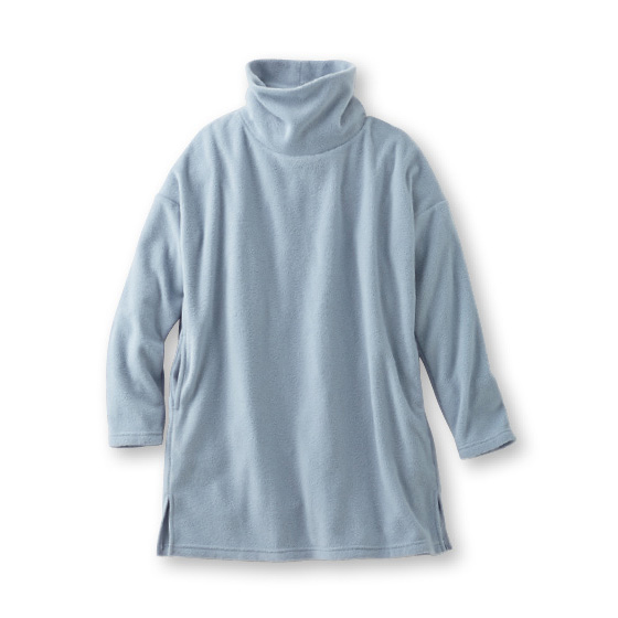 起毛部分に再生ポリエステルを使用したフリース素材。1枚で暖かく、着心地はふんわり。