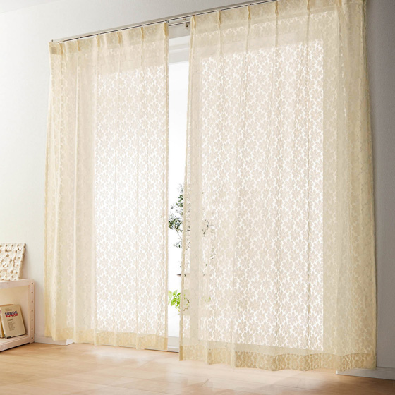 淡いクリーム色と白の2色の糸を使って濃淡を出した複雑な織り方のレース地で、綿のような風合いとキナリ色がナチュラルな雰囲気に。光が当たると、床に花の形の影がおちて、窓辺を柔らかに演出してくれる、上品なレースカーテンです。日光の当たる時間も当たらない時間も、お部屋を品よくエレガントな表情で楽しませてくれます。