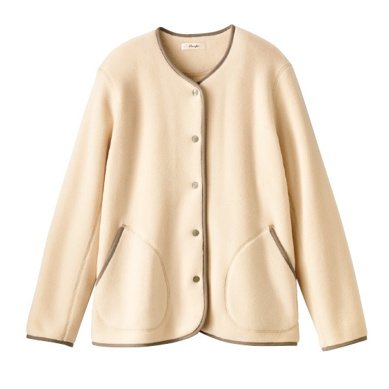 ふんわり軽いフリース生地。ゆるシルエットでニットの上にも重ねやすく、パイピングとステッチ使いでさりげなく洒落見え。