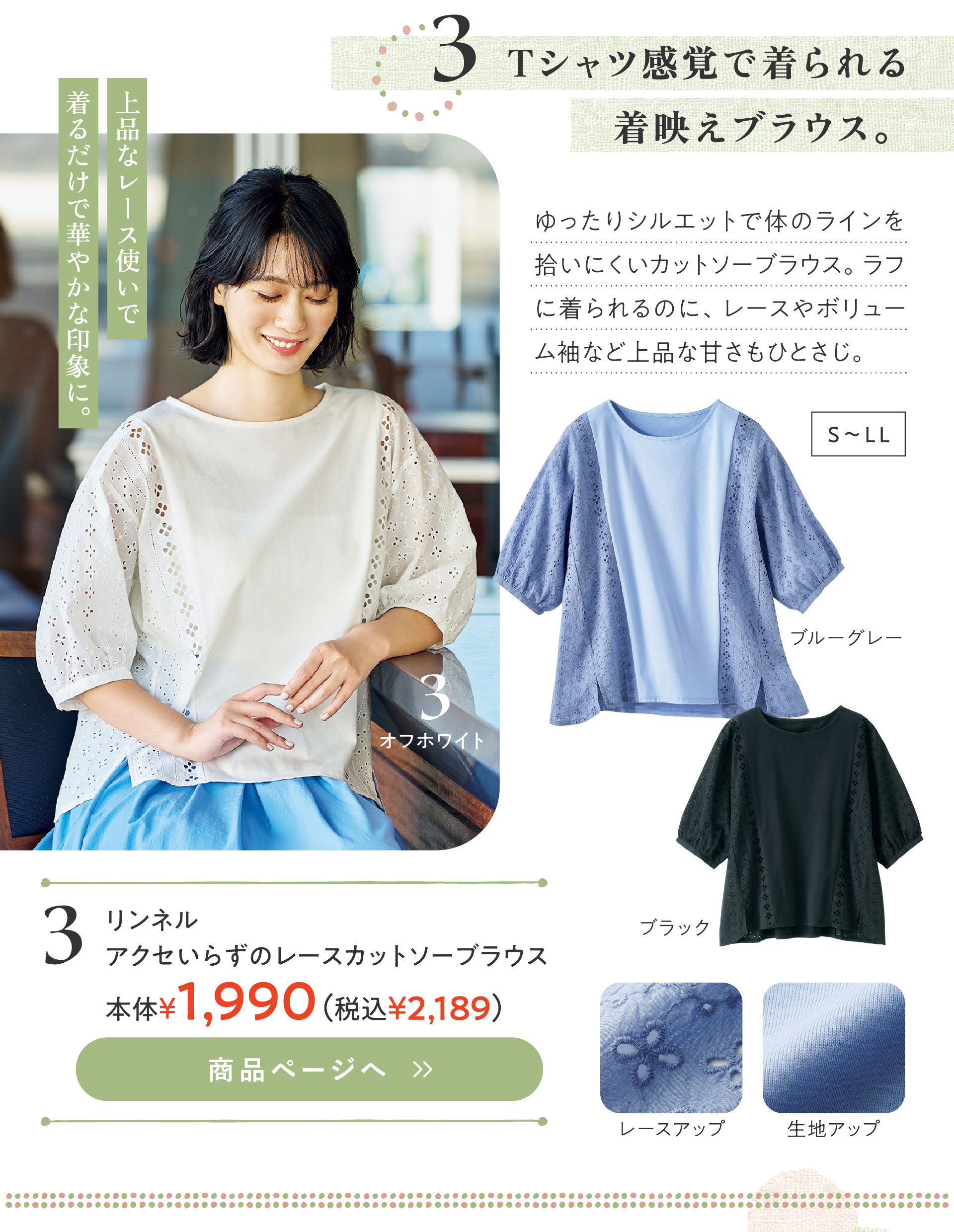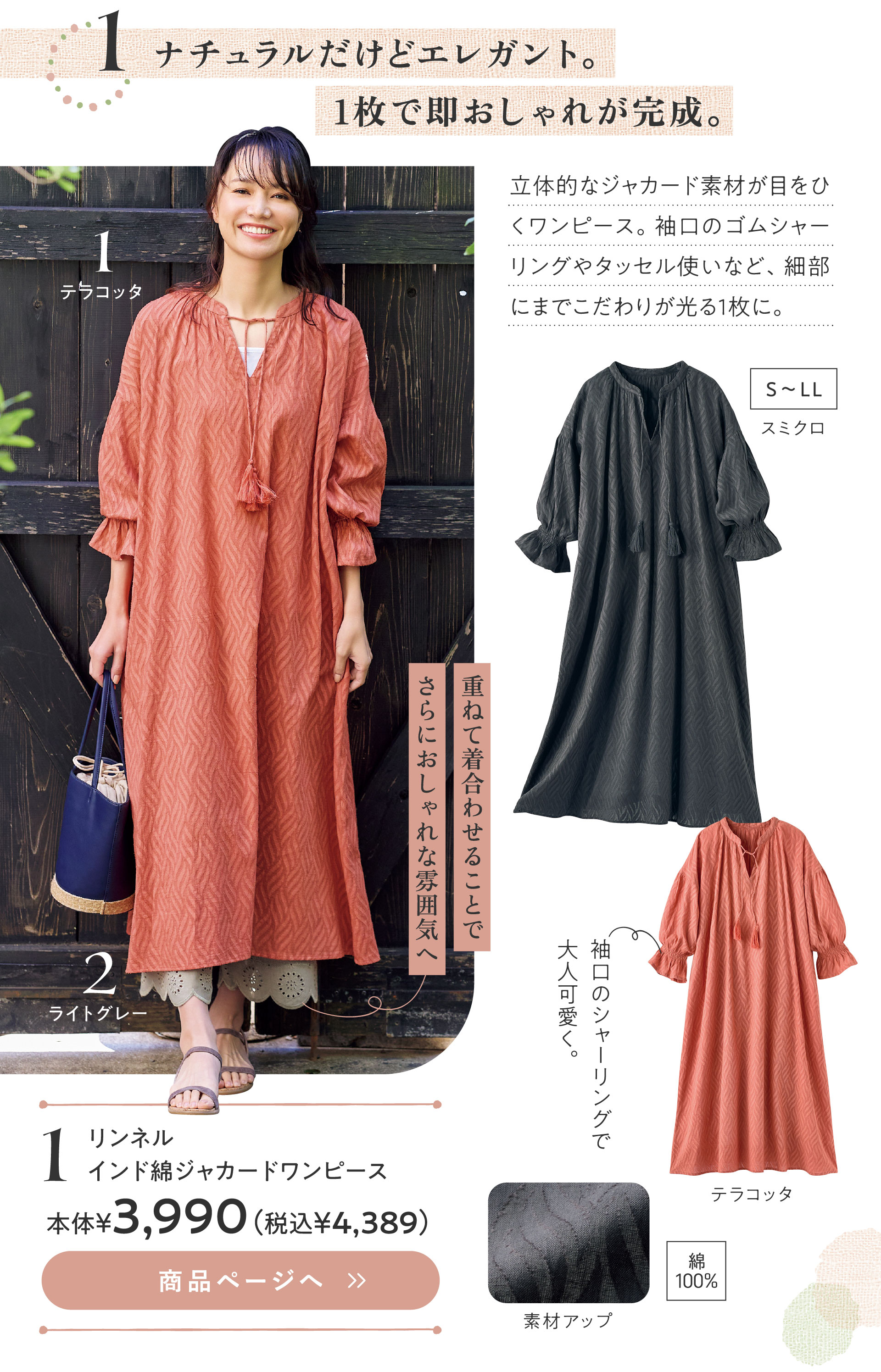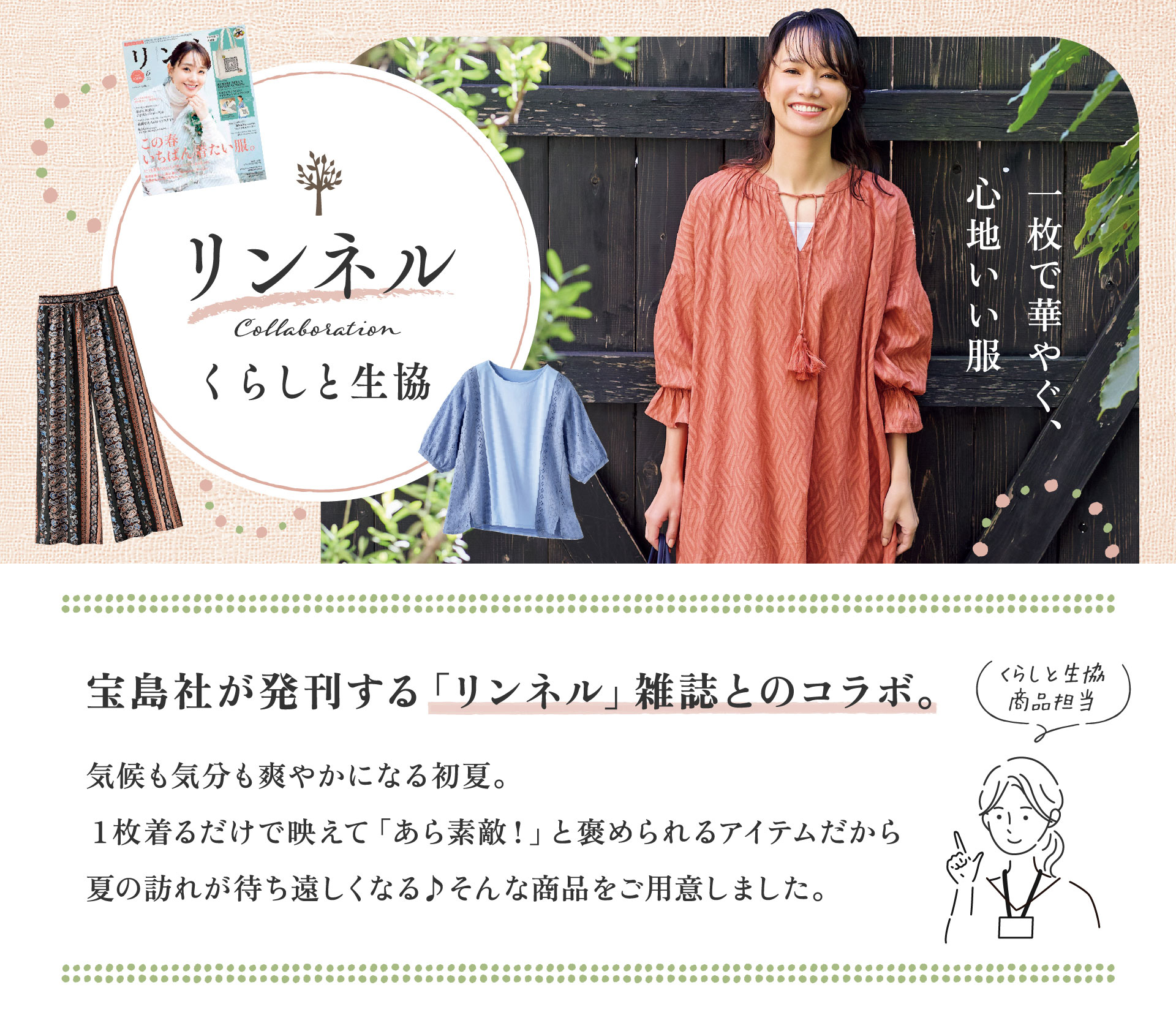 一枚で華やぐ、心地いい服 宝島社が発刊する「リンネル」雑誌とのコラボ。気候も気分も爽やかになる初夏。1枚着るだけで映えて「あら素敵!」と褒められるアイテムだから夏の訪れが待ち遠しくなる♪そんな商品をご用意しました。