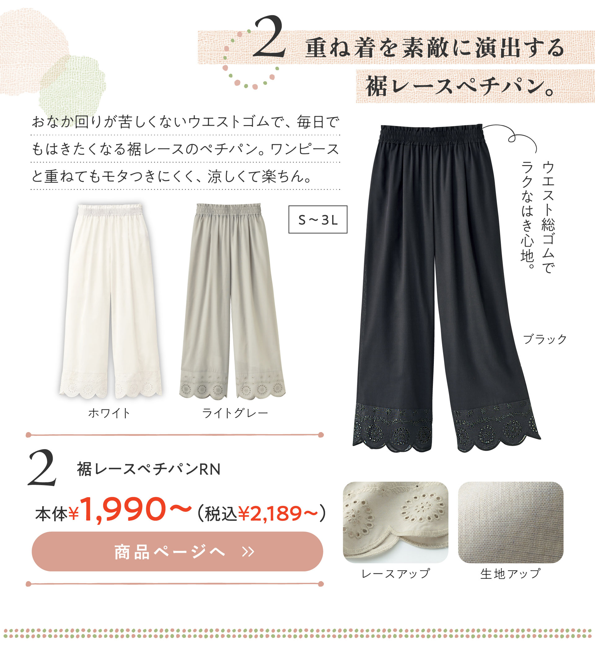 2 重ね着を素敵に演出する 裾レースペチパン。