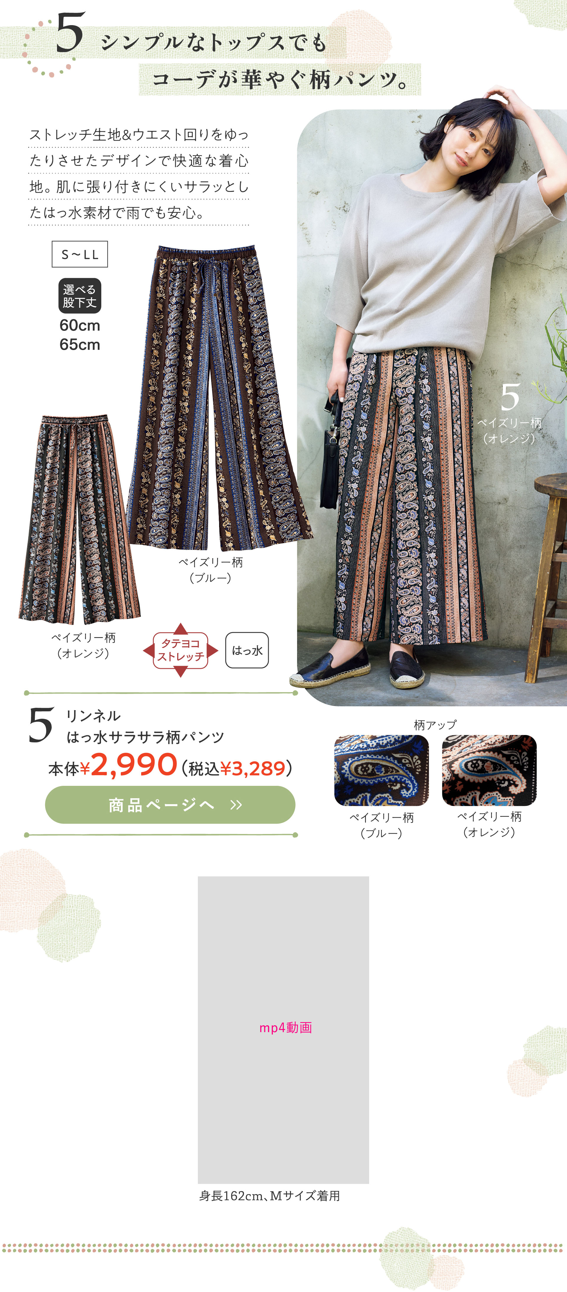 5 シンプルなトップスでもコーデが華やぐ柄パンツ。